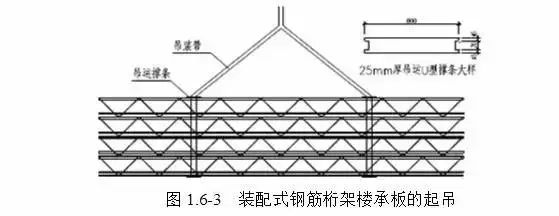 起吊時(shí),鋼筋桁架樓承板下面和上面應(yīng)設(shè)帶有U型卡口吊運(yùn)木制撐條,防止鋼筋桁架樓承板變形,偏斜等問(wèn)題。吊裝應(yīng)設(shè)置兩個(gè)吊裝帶,間距1.6m,吊裝帶應(yīng)設(shè)在桁架中部,保持起吊過(guò)程中樓承板兩端平衡,如圖所示。